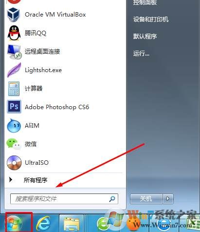 1、点击开始菜单,我们就可以看到搜索程序和文件,我们可以在这里输入程序名称或文件名来进行搜索;
