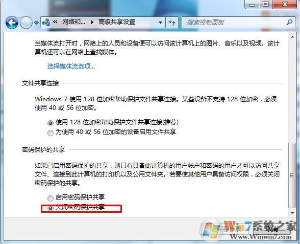 2、在密码保护的共享区域设置 关闭密码保护共享,保存。