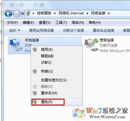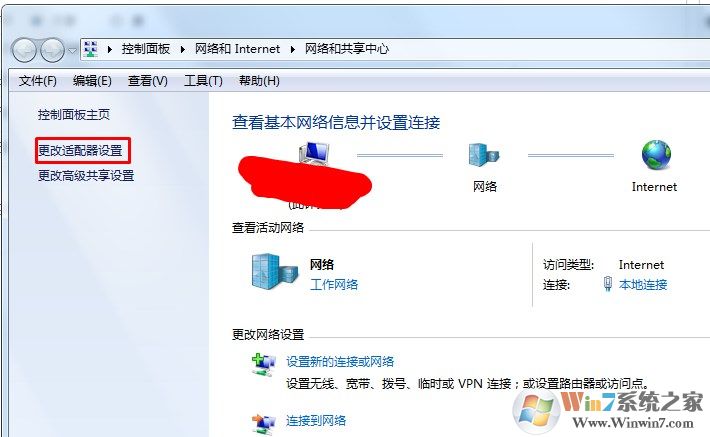首先,在Win7电脑屏幕右下角的通知区域处找到一个小电脑的图标,这个就是宽带连接的图标了,单击这个小电脑图标,然后依次选择【打开网络与共享中心】-【更改适配器设置】,在弹出来的窗口中,右键点击本地连接,先将其停用,完成刷新之后,再将其启动。