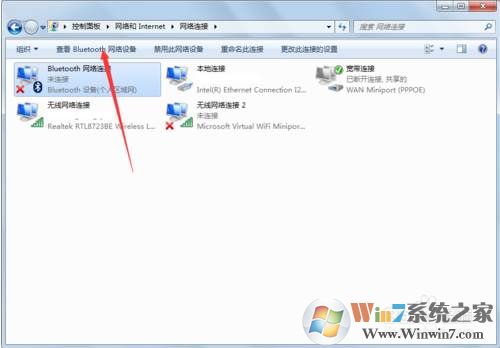 1、我们打到电脑(以下为Win7)先选择电脑网络连接页面的蓝牙,然后点击查看bluetooth网络设备