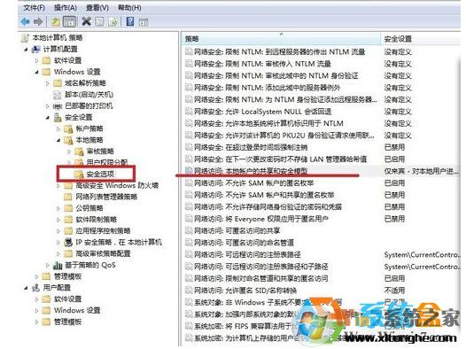 步骤四、删除完成后,再点击点击【用户权限分配】下面的【安全选项】,在右侧找到“网络模式:本地用户的共享和安全模型”项目;