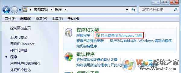 2、在控制面板界面,单击程序,然后选择打开或关闭Windows7功能。
