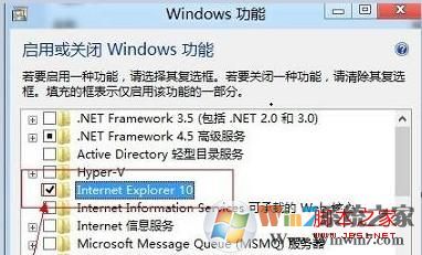 3、在windows功能列表里找到”Internet Explorer 10",将前面的勾去掉,点击确定