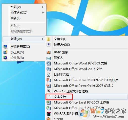 1.首先,返回到Win7旗舰版电脑的桌面位置,然后在桌面找到一个空白处,点击鼠标右键,在下滑菜单中选择新建-文本文档。