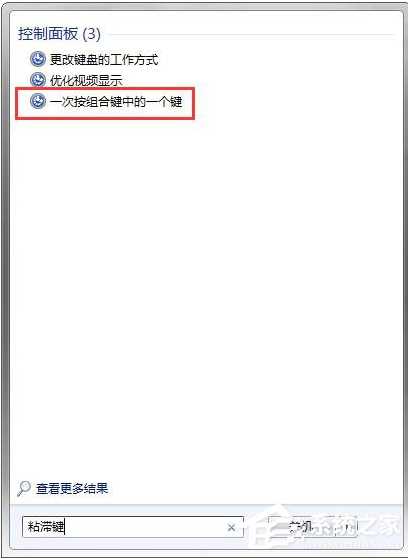 4、这样的话,下次再怎么按shift,也不会出现“粘滞键”窗口,如果你想改原来的设置话,你要开始菜单中输入“粘滞键”,就可以找到“一次按组合键中的一个键”;