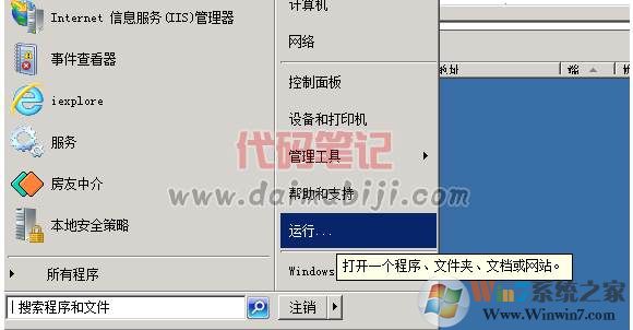 1、首先远程桌面登录服务器,然后点击开始—运行,或是WIN+R都可以。