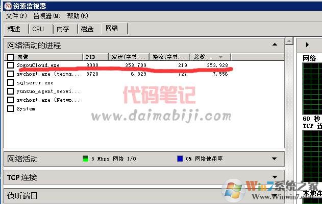 3、切换到网络,这时我们发现了 sogoucloud.exe这个进程在不停的发包,所以上行才会占用了7MB多 对,这个进程就是搜狗输入法的。就算是家用电脑。你随时占着我7MB或者更多的带宽,我还能愉快的玩耍不?