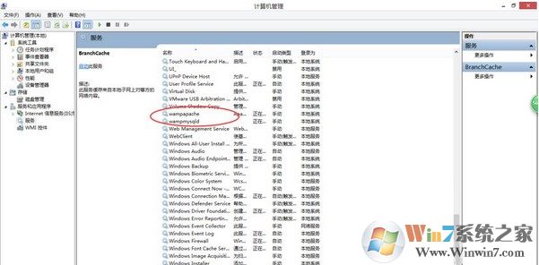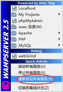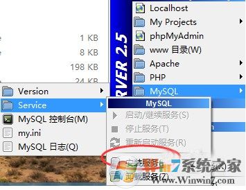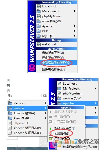 5、这两个服务丢失的重新补救方法如下:左键单击任务栏的wampserver服务器图标,然后选择Apache,service--〉安装服务;