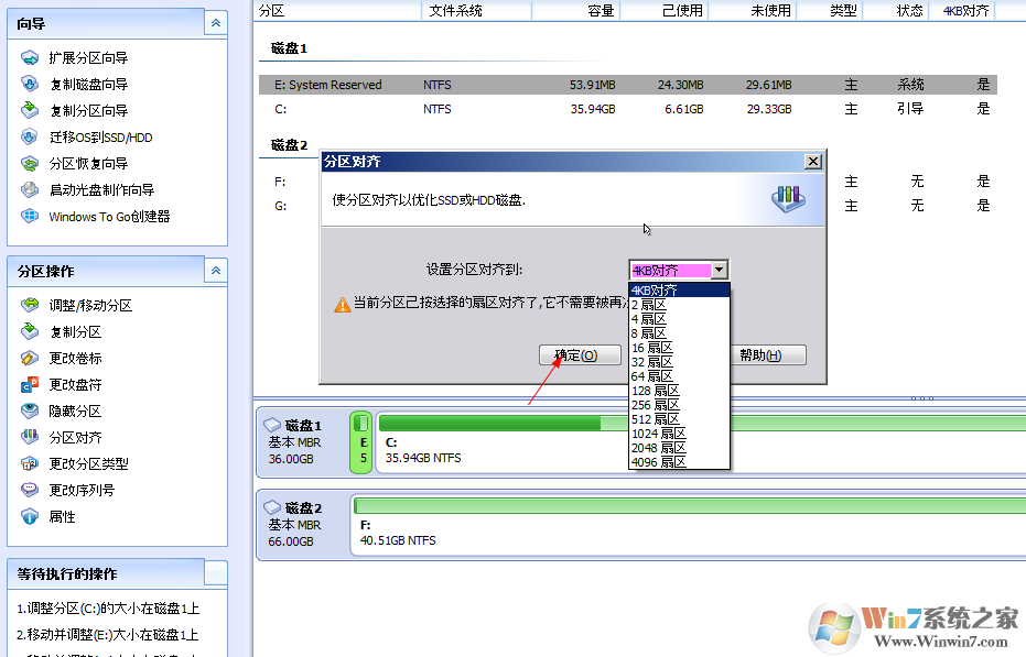 2、点击“分区对齐”之后出现确定对齐的对话窗口,选择4K对齐点击确定。