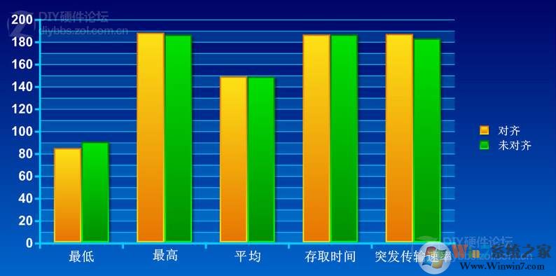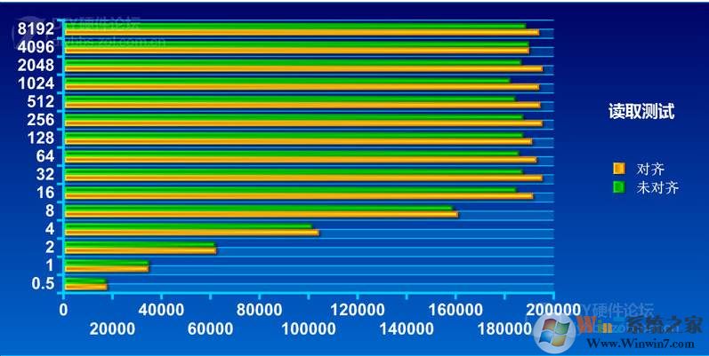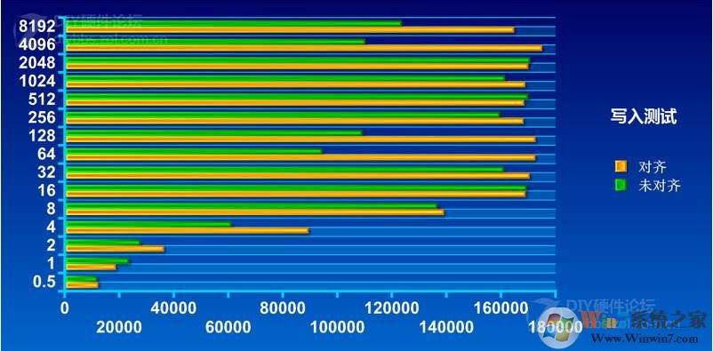 通过下面的两张读取和写入的柱状图,可以清晰的看到,读取方面,4K对齐有着较为稳定的优势,而写入方面的优势更大,所以在本项测试中,4K对齐对硬盘有较为明显的提升(下图数值越大越好)