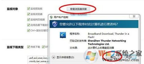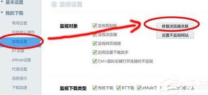 第二步,修复浏览器关联。选择我的下载后,在选择下面的监视设置。这时右侧会出现几个选项,选择修复浏览器关联,修复完成后会出现提示。