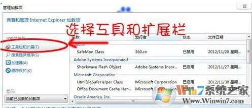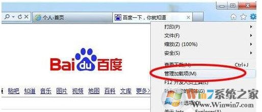 第三步,打开IE的管理加载项。打开IE浏览器,点击右上角的设置按钮,进入管理加载项,进入加载项的选择界面。