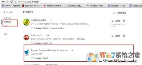 3、在设置界面中选择扩展程序,将里面的迅雷启用就可以了。