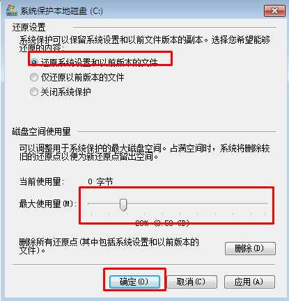 4、在系统保护本地磁盘中,选择【还原系统设置和以前的版本的文件】并设置一个还原点磁盘使用量,确定;