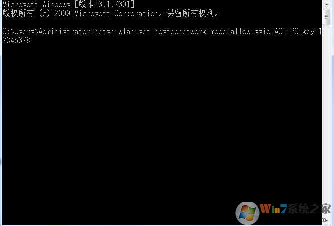 2、出现“命令提示符”输入,在界面里输入以下命令:netsh wlan set hostednetwork mode=allow ssid=ACE-PC key=12345678。回车运行