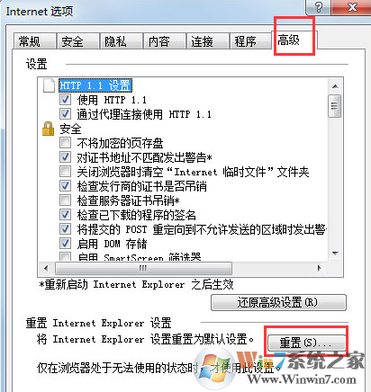 3、在弹出的Internet属性窗口中,切换至“高级”项,点击“重置”;