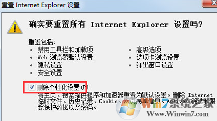 4、在“重置 Internet Explorer 设置”窗口中,勾选“删除个人设置”复选框,点击“重置”;