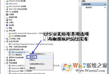 2、我的电脑-右键选中“管理”进入“设备管理器”找到鼠标,如图可以看到两个设备,一个是USB鼠标,另一个是PS/2,Win7系统识别笔记本的触控板。