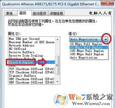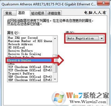 3、把网卡属性(设备不同,菜单各异)?Speed&Duplex ?Auto Negotiation 设置一下。