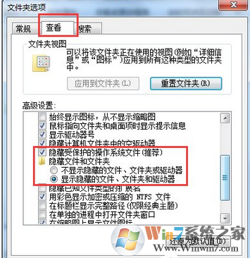 2、在文件夹选项里,选择查看标签卡找到显示系统文件和显示隐藏文件的选项显示所有文件。