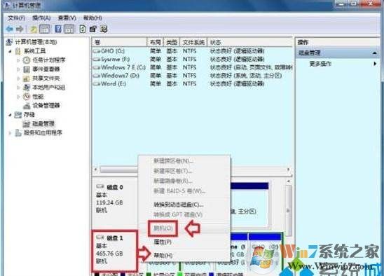 3、右键点击有问题的磁盘(脱机)→弹出菜单中点击脱机;
