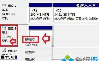 5、再使用鼠标右键点击磁盘的属性菜单,就会有联机的菜单了,点击联机即可恢复正常了;