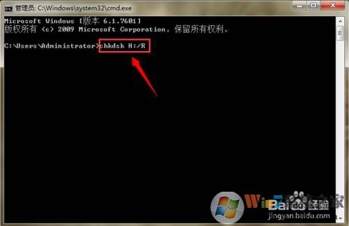 小龙这里损坏的硬盘是H盘,因此输入的是:“chkdsk H: /R”。