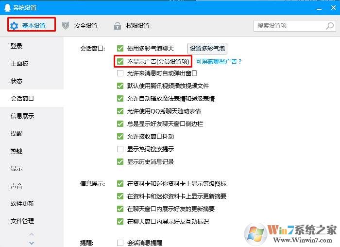 3、如果你是QQ会员,那么还可以在基本设置-会话窗口选项中,勾选,不显示广告(只有QQ会员设置有效)