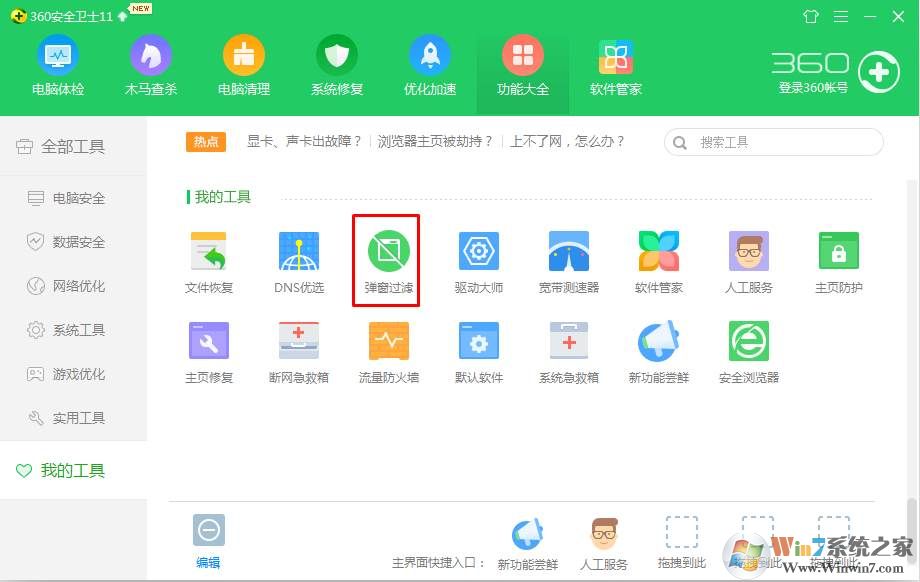 2、在所有功能中看看有没有【弹窗过滤】功能,没有的话搜索一下工具会自己安装起来;