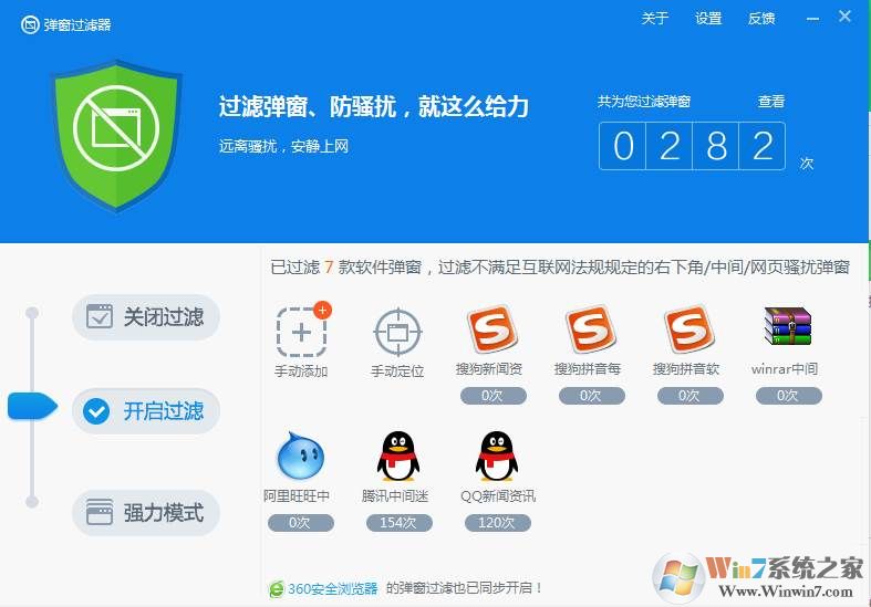 3、然后开启过滤,之后,360广告过滤会自动拦截弹窗,如果没有自动的话可以手动定位或是添加一下。