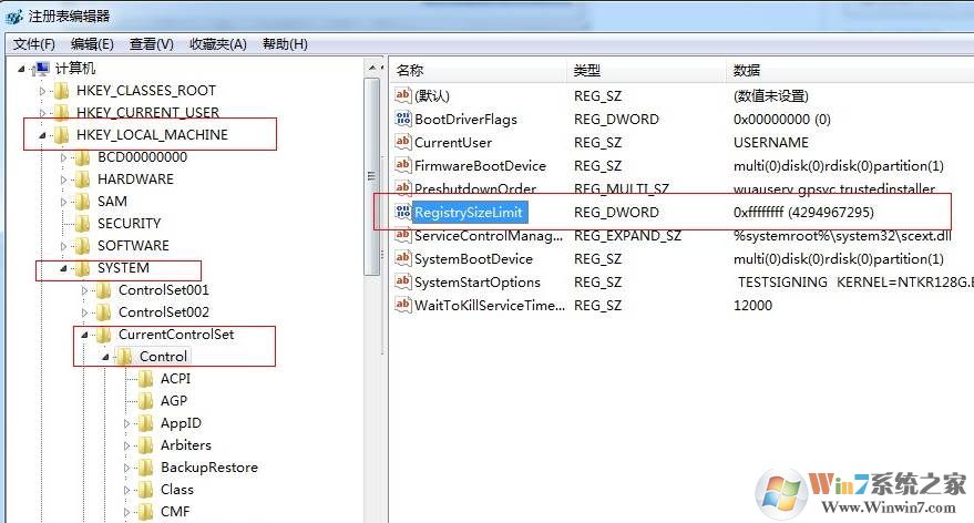 2、进入注册表编辑器 HKEY_LOCAL_MACHINE > SYSTEM > CurrentControlSet > Control 找到 RegistrySizeLimit 并双击打开 DWORD 值对话框,点击“十六进制”,并在文本框输入 ffffffff (8个f!)
