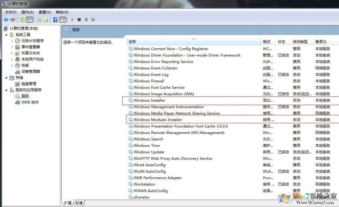 4、在管理中找到服务,确保Windows Installer和Windows Modules Installer都是启动的,如没有启动那么右键启动他们。(不能启动的,双击打开先把禁用改成自动)