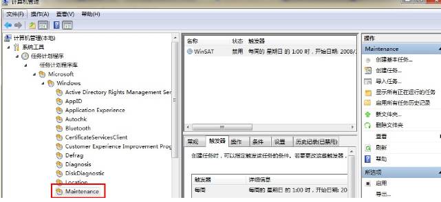 2、找到任务计划程序--Microsoft--Windows--Maintenance,在右侧可以看到WinSAT,禁用