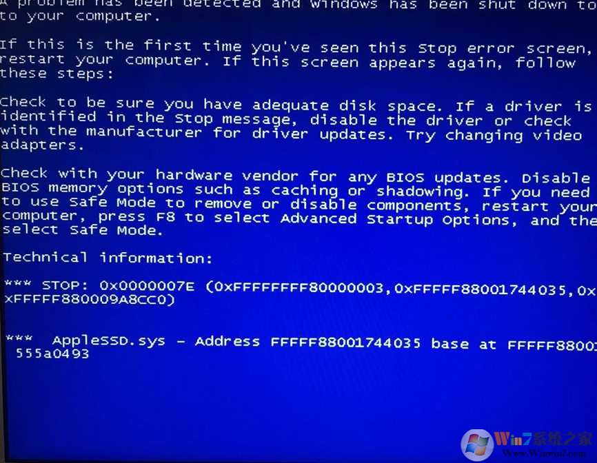 出现这个问题貌似是AppleSSD.sys和Win7不兼容导致的,大家可以按小编的方法试下,如果有更好的方法欢迎下方留言分享。