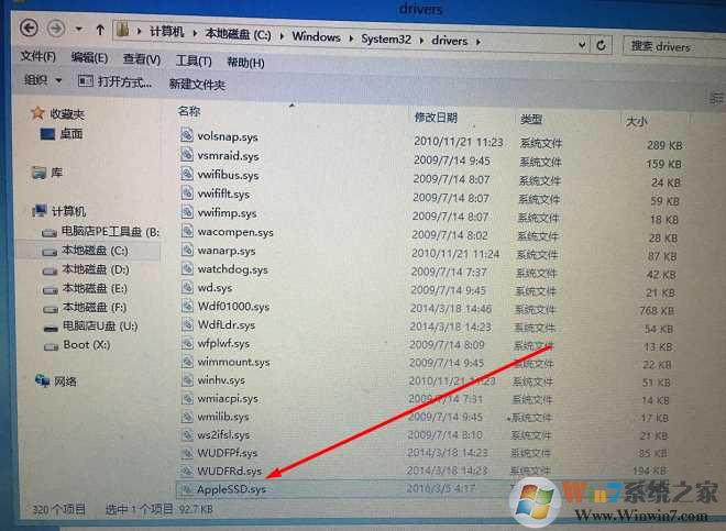 4、找到Windows所在磁盘,进入\Windows\system32\drivers\ 文件夹,删除AppleSSD.sys文件;Win11系统之家 www.xiuchufang.com