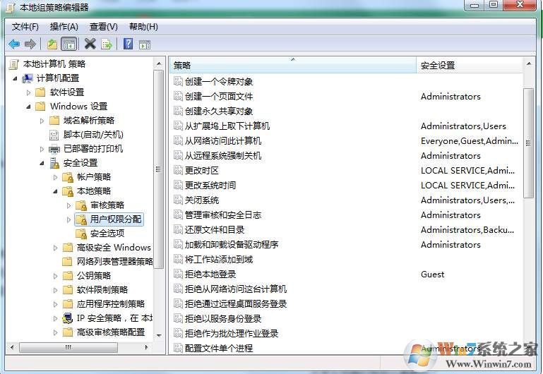 2、打开计算机配置-【安全设置】-【本地策略】-【用户权限分配】;