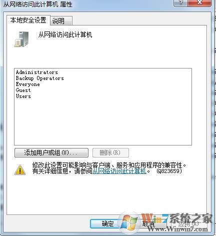 4、然后再打开从网络访问此计算机,看看里面有没有everyone guest user 等账户,没有的话添加进去;