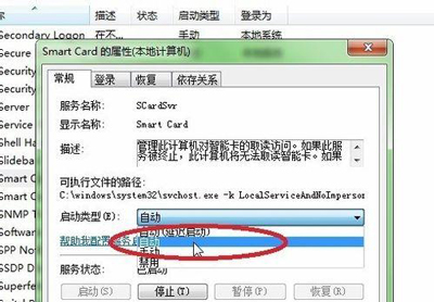 4、我们先要做的是确认系统的”Smart Card”服务是否有启动,右键“我的电脑”,选择“管理”,再点击进入到“服务和应用程序”下面的“服务”项,找到Smart Card服务项,若已启动就行,若没启动请将其设置为启动,并且类型为“自动”;