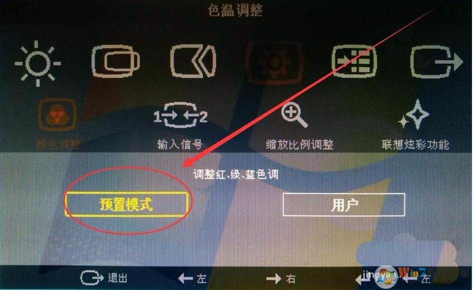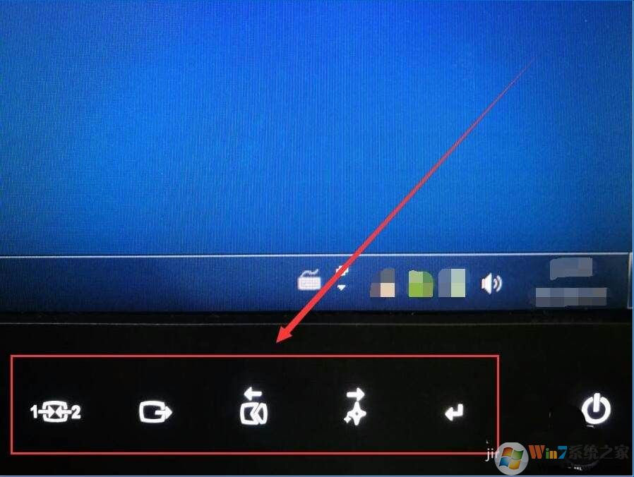 5、这时我们开始调显示器,使用显示器面板上的按钮,将显示器颜色设置为默认颜色。(预设模式)不同的显示器按钮和方法不同。