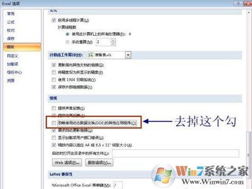 4、去掉“忽略使用动态数据交换DDE的其它应用程序”前面的勾。确定即可。