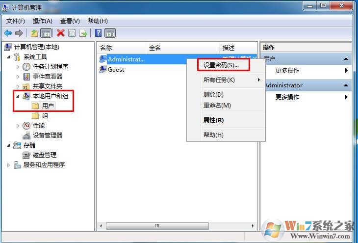 2、打开管理之后,展开计算机—【本地用户和组】——【用户】,然后在右边右键点我要改密码的用户名,选择设置密码;