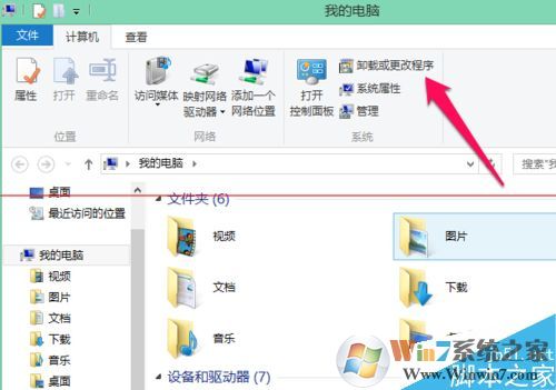 1、打开“我的电脑”点击箭头所指的"卸载或更改程序"