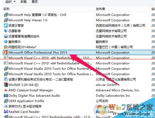 2、在程序列表中找到office 2013,然后”右键“选择”更改“