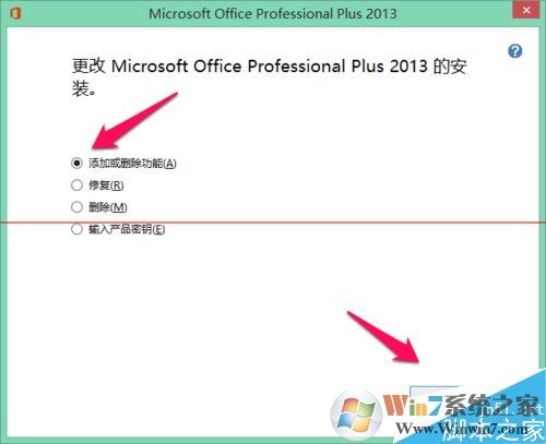 3、在弹出的窗口中选择”添加或删除功能“,然后点击”继续“按钮