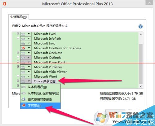 4、在出来的窗口中找到”office共享功能“点击文字左边的倒三角,选择”不可用“然后点击继续,在弹出的安全警告对话框中选择”确定“
