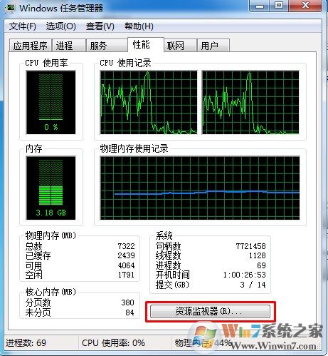 3、如果这个进程占用cpu是有波动性的,我们就在性能里面,我们可以监视CPU的使用率。打开资源监视器。然后将一直占用CPU比较高的进程关闭,查看到底是哪个进程或者程序使用CPU资源。