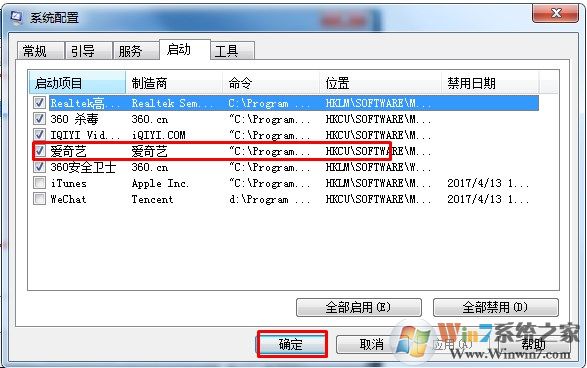 5、启动里面,我们将开机不自动运行的程序前面对勾取消,这样可以避免很多程序开机自动运行,从而开机以后,就自动在我们电脑后台运行,占用CPU。