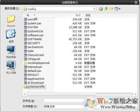 4、在弹出的选择定位框里把路径定位到c:\windows\system32\config这样你就可以看到注册表文件的本体了(这里为windows