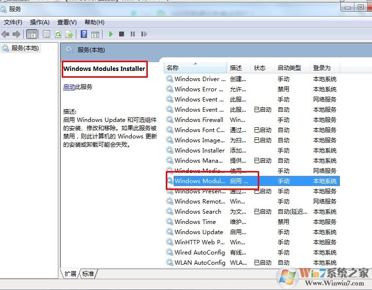 2、我们在服务(本地)窗口找到:Windows Modules Installer服务,查看是否被禁用;