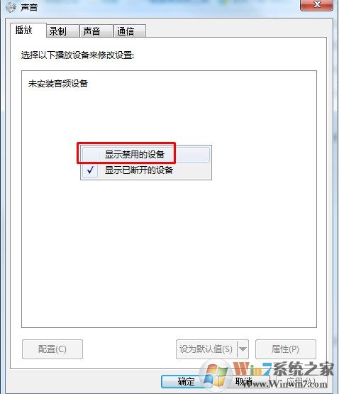2、右键单击:未安装音频设备,在出现的小窗口中,左键点击:显示禁用设备;